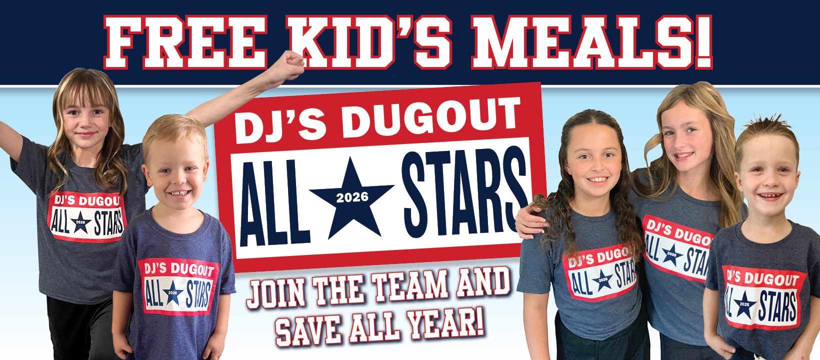 Kids must wear a DJ’s Dugout All Stars T-Shirt to receive a FREE kid’s meal or 1/2 price kid’s meal each visit.