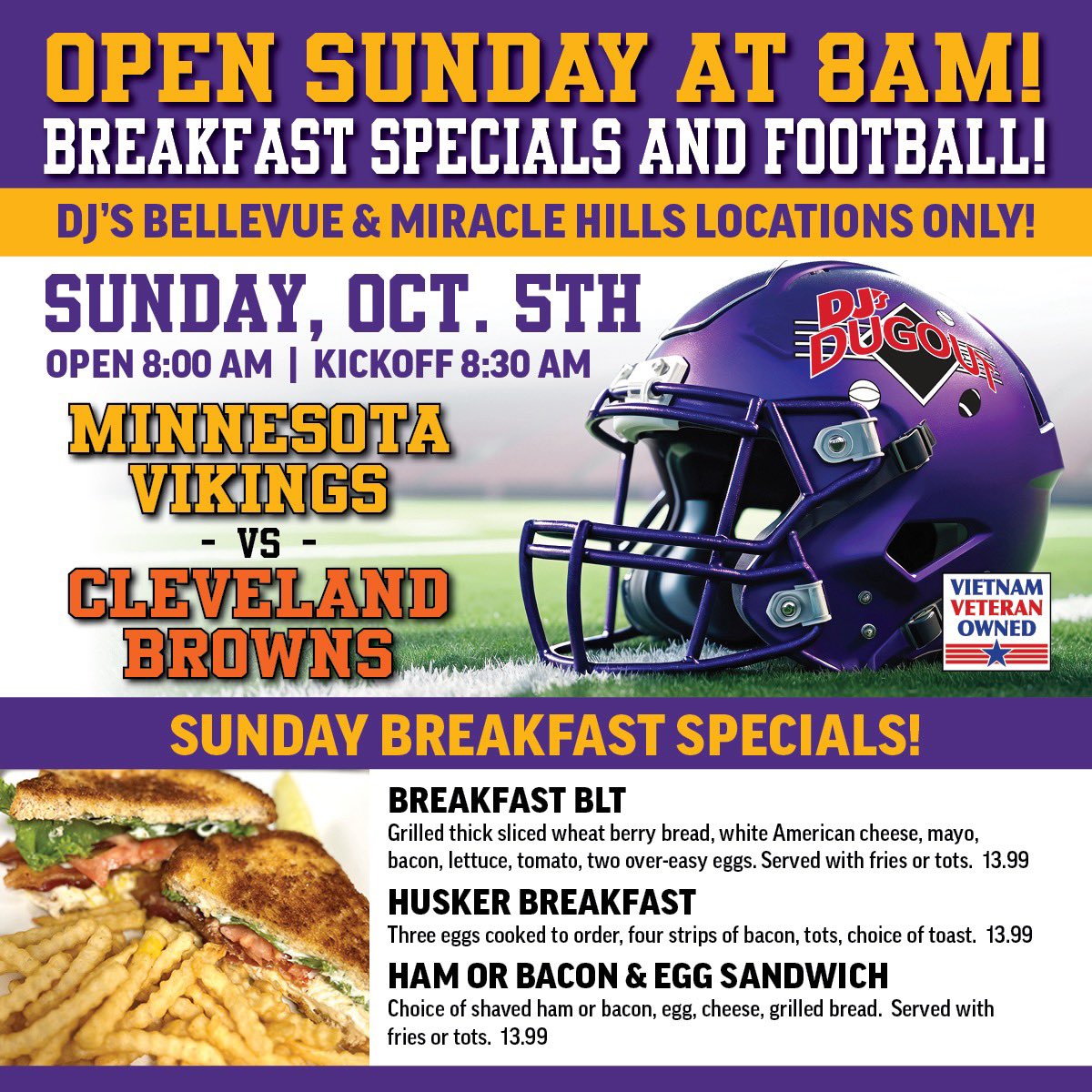 BELLEVUE & MIRACLE HILLS LOCATIONS ONLY will open this Sunday at 8:00am ahead of the Vikings vs Browns game @ 8:30am! Great Sunday Breakfast Specials & a fun NFL matchup, see you Sunday morning at DJ's Bellevue & Miracle Hills locations! 😁